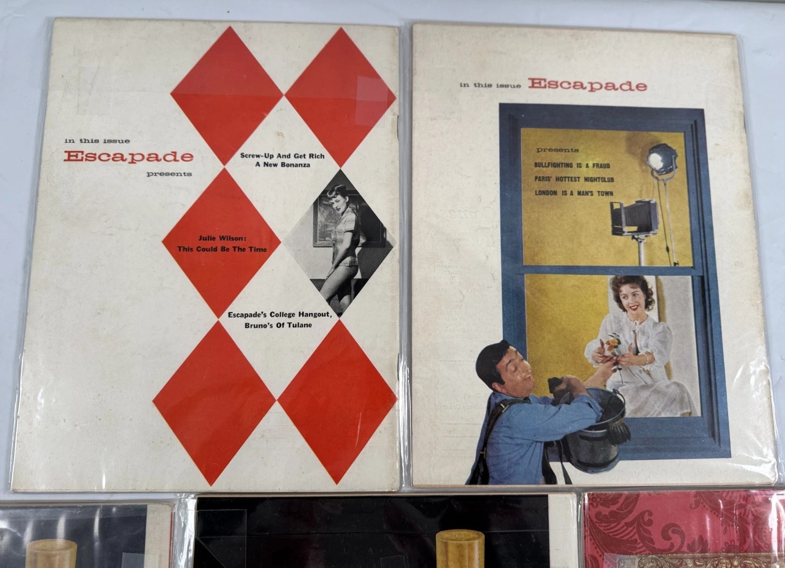 Vintage Lot of five (5), 1958, Adult Men's Pinup Magazines. You will receive 4 Escapade 1958 issues (Feb, Apr, Oct & Aug); and 1 Gent 1958 magazine (Dec). They appear in G to Ex condition (view photos for the exact issues you will be receiving so you can make your own condition judgements). These magazines are all in plastic and although they were not removed, they do appear complete.
