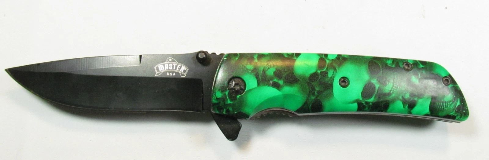 NEW Master USA, Spring Assisted pocket knife, Model #MU-A005. This knife has a green skull handle design.